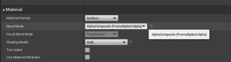 The Material BlendMode was set to AlphaComposite to be able to write a value (Range 0.0 - 1.0) into the alpha channel by using the Opacity output.