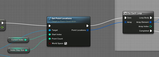 With this node you can read back a range of point locations, which will be returned in an Array of Linear Color (float4). With the flag WorldSpace all locations will be auto converted into World Space if necessary. The range can be set by a Start Index and a Point Count. This way you can step through the current Point Cloud over time. Maybe using 1000 points per step every 100ms.