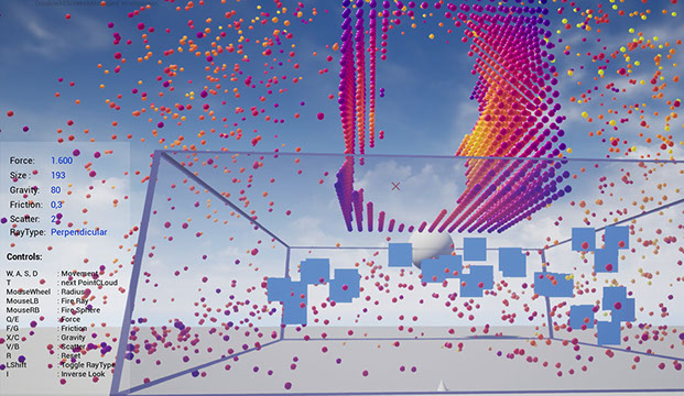 Within the demo scene Physics_Readback, points that fall down into the translucent box will get marked by DrawDebugPoint (just for demonstration and testing) in steps over time.