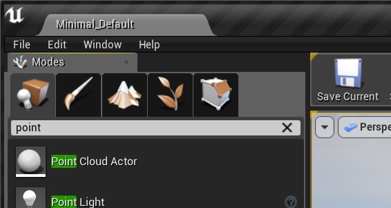 Without going into all the details, here is what you need to know to have a first look. In the Editor go to the Modes panel (usually on the left side). Select the Place tab (default) and type into the edit box: “point”. “Point Cloud Actor” will show up in the list below. Drag it into the scene and an icon with 9 dots in a grid will show up.