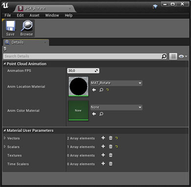 A PCA is a Data Asset that can be created by copying an existing one or by right clicking into the Content Browser, then go to Mics/DataAsset and select “PointCloudAnimationSetup” as a data format. All the data of a Point Cloud will end up in a Render Target, which opens up the opportunity to animate them with a Material. The location data and colors are passed in by a TextureParam2D called : Locations and Colors. The current UV coordinates are addressing the current Point within those Textures. These values can be used to calculate any kind of animation within a scriptable Material (in a separate pass). For more information on the Materials look at Materials for Location and Color.